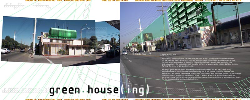 initial development ~ In the beginning, I hoped to find sites within the city that have been somehow overlooked or forgotten. I sought to find a piece of residual or marginal space that seems unusable, but could be successfully reoccupied with a program or programs whose possibilities have heretofore gone unnoticed. The intent was to provide a scenario whose formalism would be convincing in the goal of having and owner or a city reevaluate the importance of a piece either publicly, commercially, or infrastructurally. ~ Now, the focus has been placed upon sites of occupation which are either not optimized by their current program's singular use or have caused their urban surroundings to suffer from over development due to their inefficient use of resources. These sites would benefit to some degree by the structural facilities and occupational behaviour that would be brought by the supplement of an adjacent and sometimes coincidental program. By searching within property boundaries, I hope to expose hidden opportunities for the occupant, the supplement, and the - immediate and complete - urban condition. ~ A few typologies have are proposed, and some of the resulting conditions of these, in either cases of experience or of artifact, have been described, with the intention of demonstrating validity or success of a particular match: : tj+dj : sunday,monday,tuesday, etc. school : the god boys : little rock : blighted + rabbit refuge : 1066 : smart 'not' final : 1100 solar : 1100 green : 1100 solar 2 : home aviary : bookmat : lee + wind : miss donuts public library : parkroof : pinkdot : roof 10 copy : roof 5 : squid tower : water home : whale tower : xla ~ Depending on the success of the marriages, examples will be found and investigated for attributes that are either lacking in abundance or available for exploitation. at this point, case studies can be developed to demonstrate the intent of the thesis can be carried out in a variety of situations without supposing that a particular formal set must be followed. ~ The focus will hence be set upon existing programs that will not only benefit one and another, but will provide a third and fourth benefit defined by new opportunities placed for both the familiar user and in the urban environment of their unfamiliar neighbors. Elseworlds This thesis offers a remedy for the contest raging between slow growth initiatives and the inherent American demands for personal space. A cursory glance across the urban fabric makes clear the abundant wasted resources and crumbling infrastructure; a meticulous inspection of the under-utilized material and marginalized spaces reveals conditions primed for an opportunistic settlement. The efficiency of built environments with respect to the programs with which they are filled is scrutinized; the results provide shortcomings and abundances which are reinterpreted as openings for other propositions. The result is the mating of traditionally autonomous programs in a manner that provides more chances for efficiency - spatially, fiscally, and environmentally - than they could achieve independently. If one program lacks resources, the other offers its unused territory; where one program is not using its territory most efficiently, another peacefully invades. Surpassing the notion of hybrid which exists solely as a novelty, the intent is to nurture a healthy symbiosis where two or more conditions merge into a third body that plays a role for each program, yet also performs in the community on its own. As this entity is introduced to the neighborhood, it initially may serve as a tool for the existing programs. After the period of familiarization, it will be open to reinterpretation, perpetuating its reuse through ensuing communities and civilizations. The scenarios exist within one district, a typical West L.A. neighborhood. Modest and unassuming, this neighborhood serves as a proving ground for general proposals that are strategically placed to demonstrate the community reaction to its defragmentation, rather than the formal value of the symbiotes. : bookmat : suburban national park : suburban national park : green hous(e)ing : defragmenting drive c: return to top thesis content written by and property ashley moore, 2000-2015valid: xhtml css |